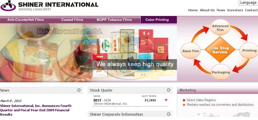 美国纳斯达克上市公众公司赛诺国际有限公司是一家在美国纳斯达克上市的公众公司(股票代码:“BEST”)。公司在美国内华达州注册,总部设在风景秀丽的海南省海口市,在海口市和珠海市两地设有4个下属企业。 我们研发、生产、销售软包装薄膜及提供彩色印刷服务 赛诺国际有限公司主要从事软包装薄膜的研发、生产、销售及一站式的彩色包装印刷业务,主导产品和服务包括:激光全息防伪膜、涂布膜、BOPP烟膜,BOPP普通膜等软包装薄膜,以及一站式的彩色包装印刷服务。我们的产品质量达到国际先进标准,获得美国FDA和欧洲ECC权威认证,出口到美国、欧洲、澳洲、亚洲等地。 赛诺国际拥有… 高科技塑料膜制造业; 2007 年成功为赛诺国际有限公司在纳斯达克资本市场上市; 我们为赛诺公司提供证监会要求的日常信息披露; 我们为赛诺公司推荐经验丰富的独立董事,并帮助该公司与澳大利亚的一家该行业的专职营销的世界知名企业进行并购的谈判和为公司设计发展规划以及融资计划。一旦并购完成,该公司将会立即拥有全球性的销售网络。 >>>> 详细介绍 3. SOKO Fitness and Spa Group, Inc. (哈尔滨)(OTCBB: SOKF) http://www.sokofitness.com/home.htm