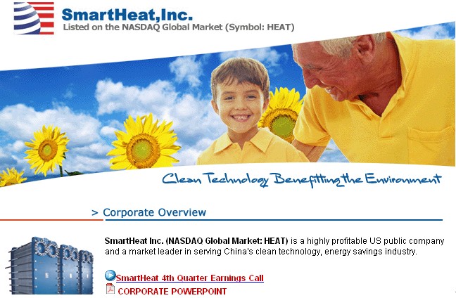 1、服务/娱乐业公司(哈尔滨,沈阳,北京);在OTCBB 柜台公示板上市; 2、为其提供日常公司治理的咨询,以及证监会要求的信息披露; 3、为其高管推荐合适的高管责任险; 4、介其绍与公司规模和发展目标相匹配的投资银行和融资顾问为其设计融资方式和结构,融资操作,为该公司操作国内并购,扩大市场份额提供资本; 5、我们为该公司在完成新一轮的融资和扩张后,立即登陆纳斯达克资本市场。 >>>> 详细介绍 4. 睿能集团 ( SmartHeat,Inc. )( 沈阳 )( 纳斯达克全球市场:HEAT ) http://www.smartheatinc.com/